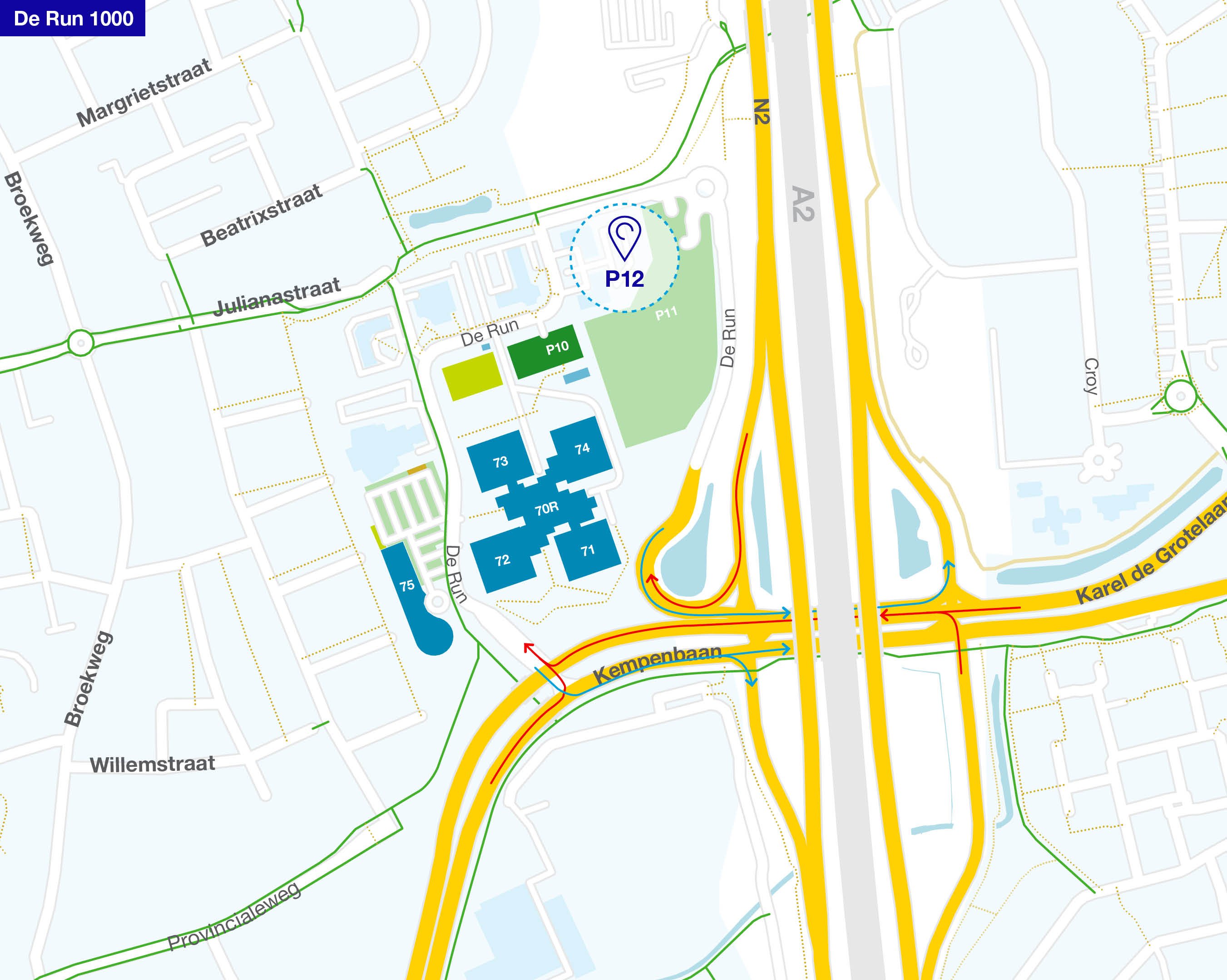 P+R Koningshof en P11 worden al gebruikt, en de nieuwe parkeergarage op De Run 1000 (P12) is in voorbereiding. Vanaf de parkeergarage op De Run 1000 worden mogelijkheden geboden om verder te reizen naar De Run 6000 en 7000. Hiervoor stelt ASML shuttle busjes of e-bikes beschikbaar. Daarnaast kan in de toekomst gebruik gemaakt worden van de buslijn (HOV-4) die station Eindhoven Centraal met Veldhoven verbindt.
